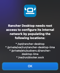Rancher Desktop will ask for elevated permissions to manage its installation directory (/opt/rancher-desktop), Lima environment (the virtual machine environment, learn more in this article), Docker socket (for communicating with dockerd/moby from the CLI).