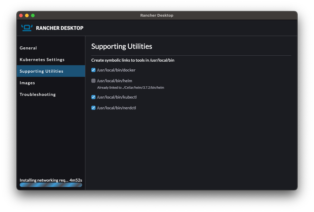 Rancher Desktop also creates symlinks to support docker, kubectl and nerdctl natively in the system PATH from /usr/local/bin. No further configuration is necessary to make things work on the CLI.