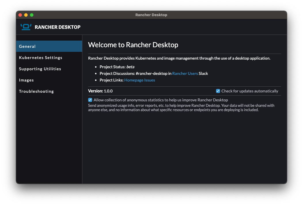Kubernetes is built in to Rancher Desktop. Kubernetes is provided by k3s, a lightweight certified distribution. With Rancher Desktop you have the ability to choose your version of Kubernetes and reset Kubernetes or Kubernetes and the whole container runtime with the click of a button.