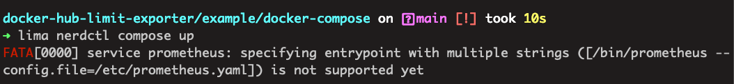Following the documentation, this can be done with nerdctl compose inside lima. Unfortunately, it does not like the entry point with multiple strings.
