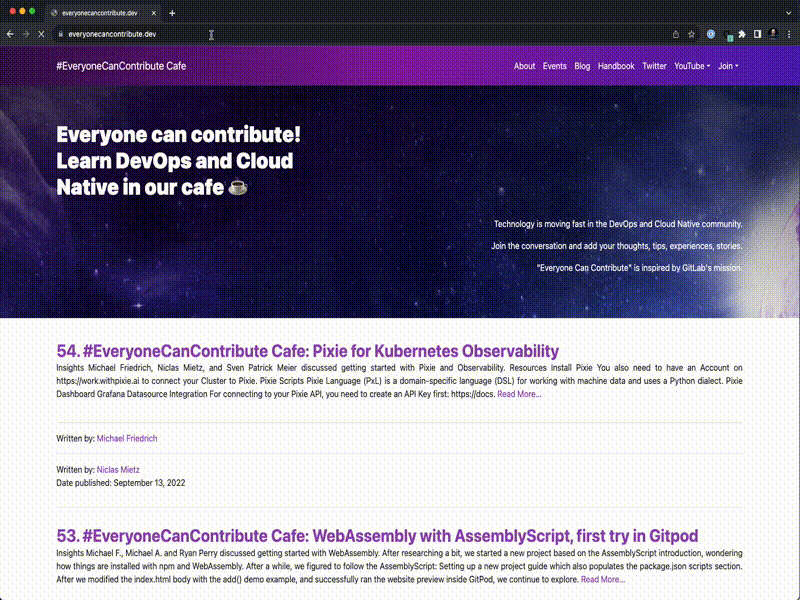 In my first months at GitLab in 2020, we created the EveryoneCanContribute Cafe, a community coffee chat and meetup for learning technology together, live streamed on YouTube, low level of shame. Who remembers the 2.5 hours session learning Rust together?