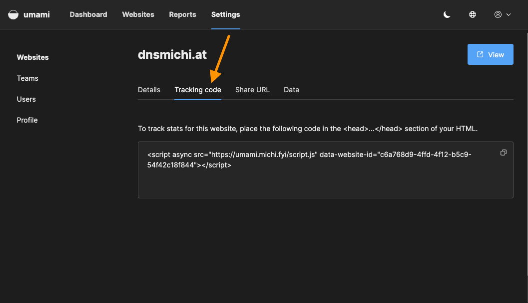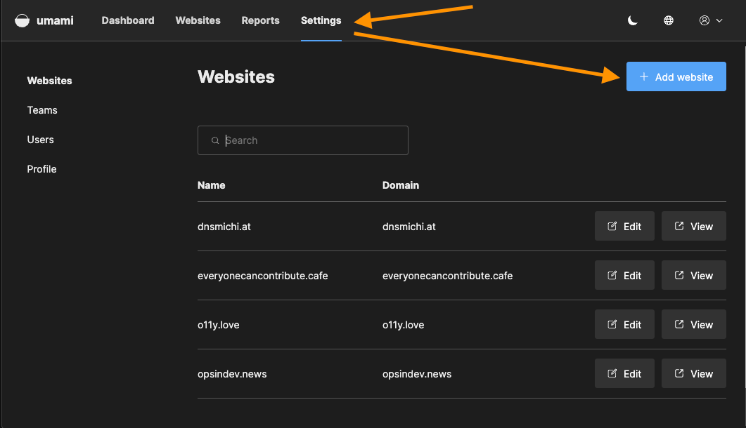 Open Umami in your browser, and log in. You are greeted with an empty dashboard, and need to configure data collection first.