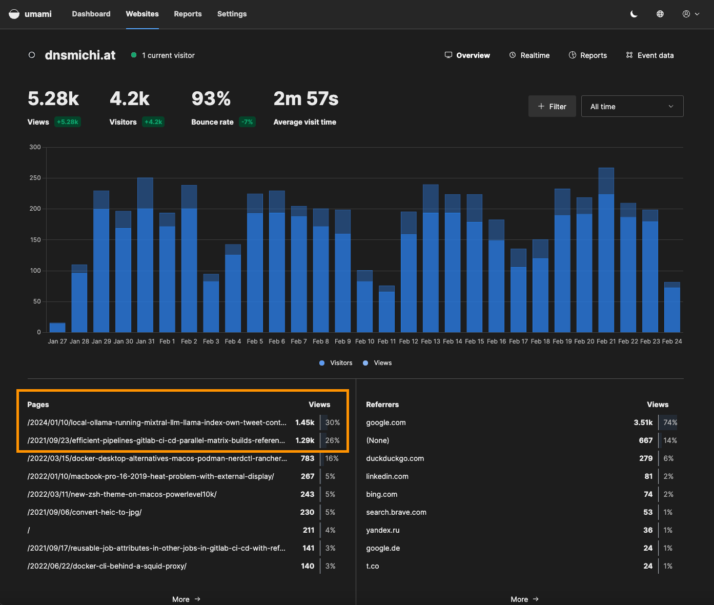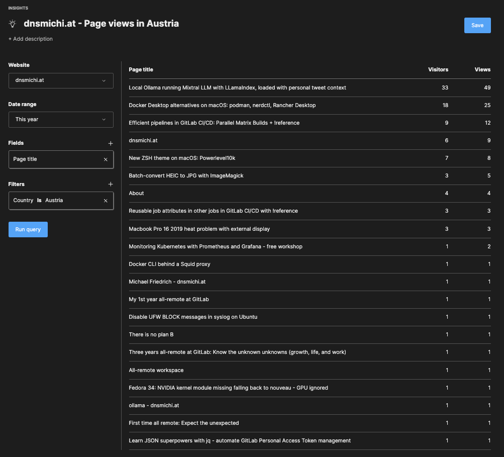 After running Umami for 4 weeks now, I see AI and CI/CD topics trending at the top 56% of views (my two main work focus areas in 2024). This helps refine my public learning strategy on my personal blog, when not publishing on the GitLab blog :)