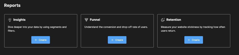 You can create custom reports based on the filtered data: Insights, Funnel, Retention.