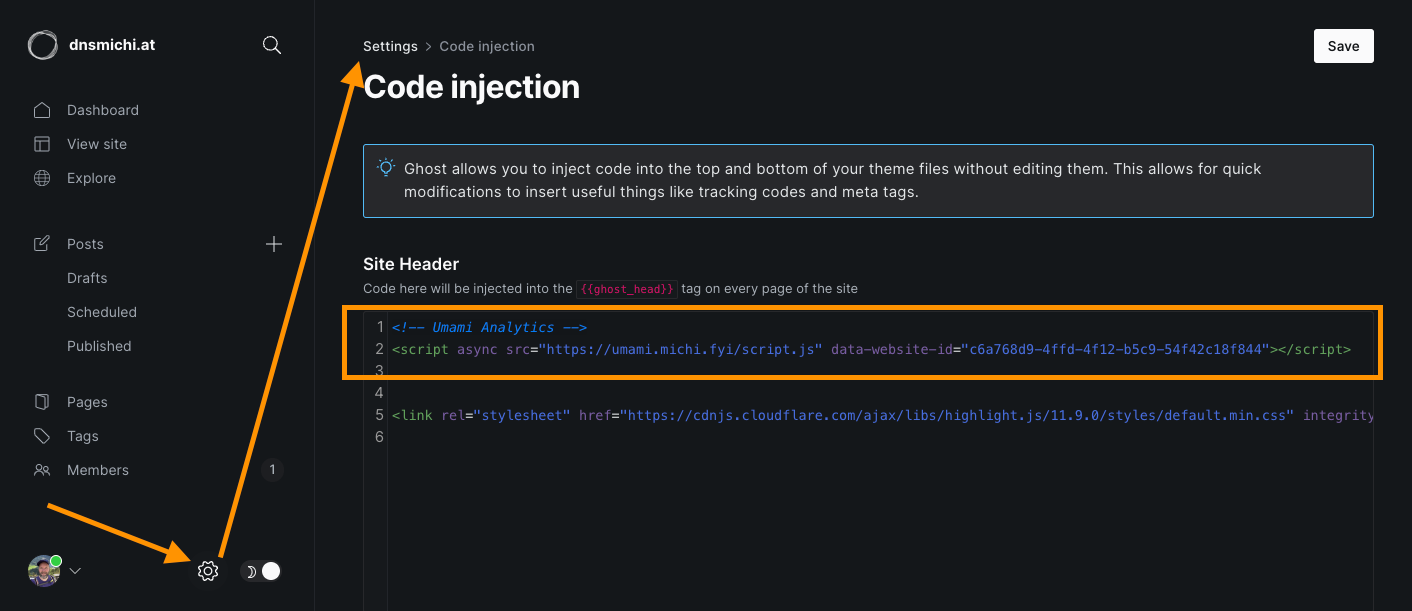 Ghost supports custom Javascript through Code injection in the settings. Log into Ghost, and select the settings icon at the left bottom, path is /ghost/#/settings. Navigate into Code injection, and add the Umami snippet.