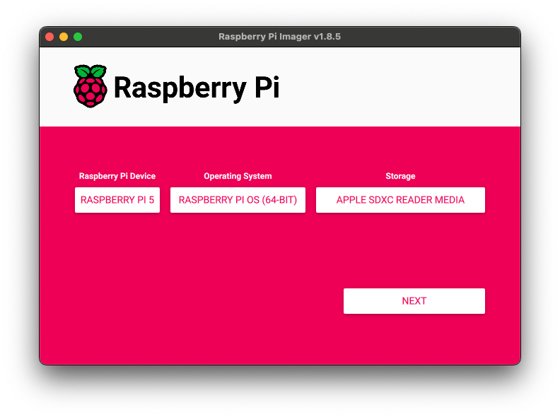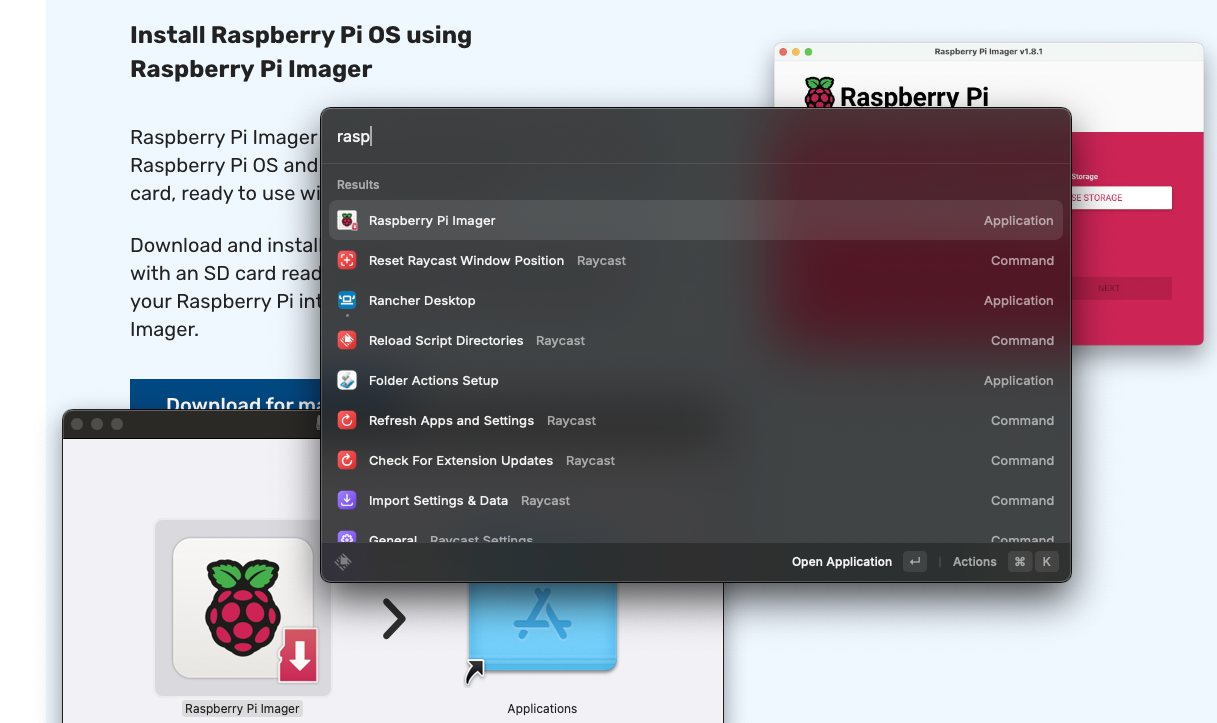 Follow the official getting started documentation and download the Raspberry Pi Imager. On macOS, double click the dmg and drag&drop the Imager into the Applications directory. Next, either navigate there or use a shortcut tool like Spotlight or Raycast to open the application.