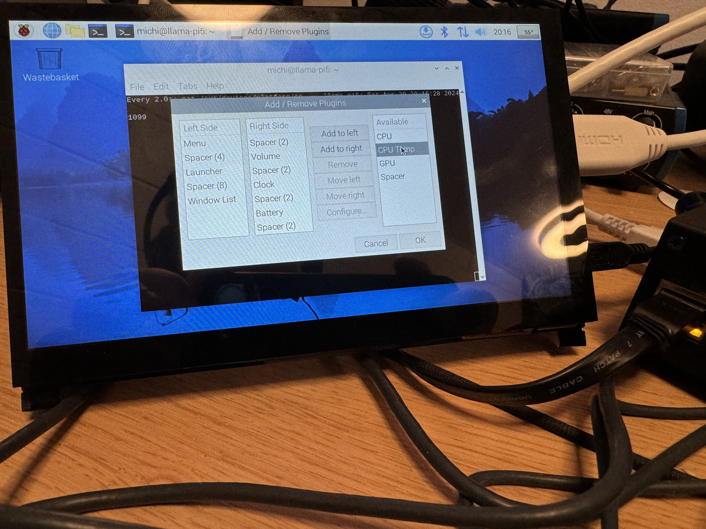 temp=56.5'CYou can also add the CPU temperature into the task menu. Right click on it, select Add / Remove Plugins and select CPU temp from the right Available column. Click on Add to right and OK to show the temperature on the upper right corner.