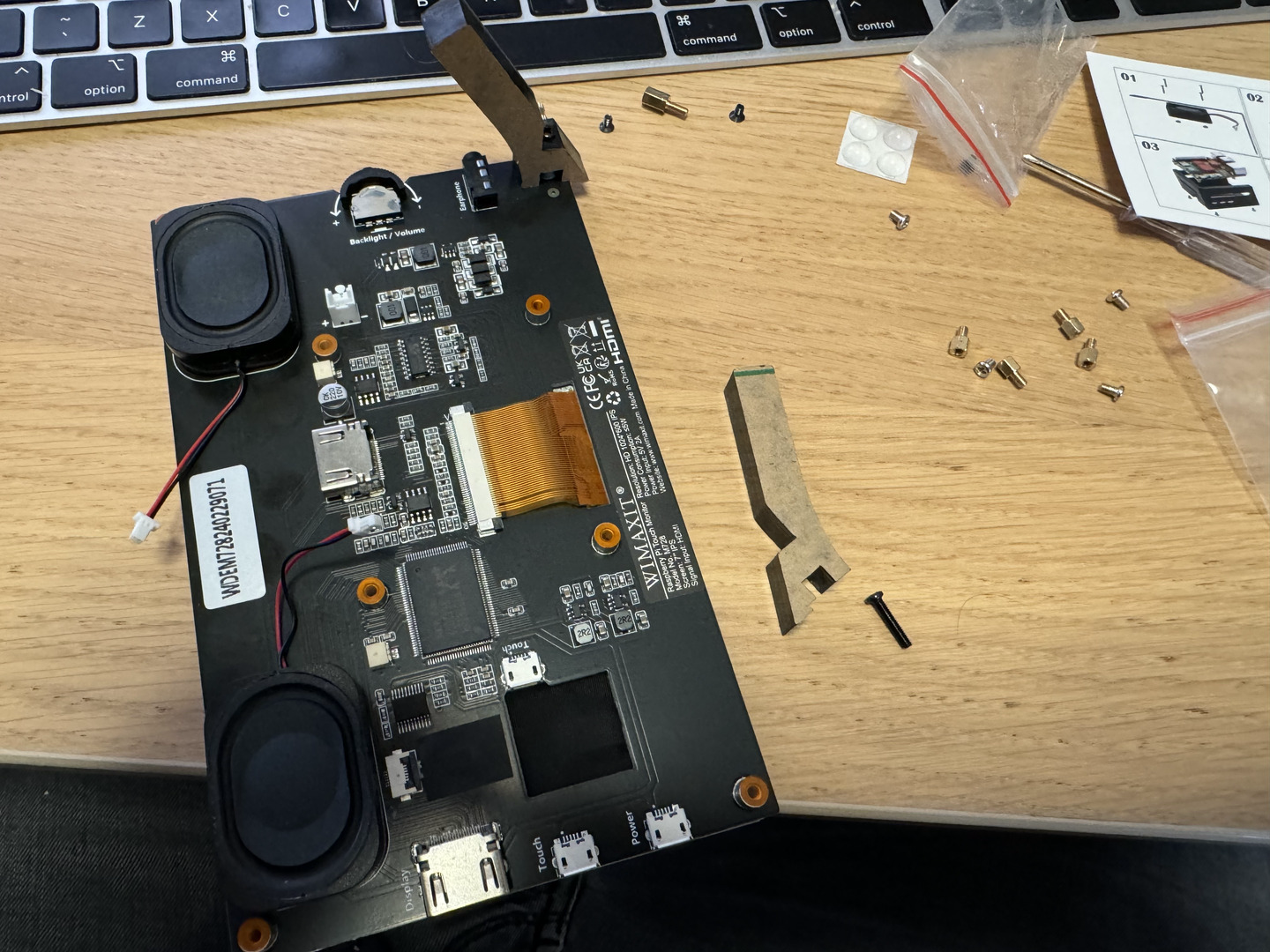 Assemble the stand using two screws, add the audio speakers. Then connect the touch screen using the microHDMI port, and the USBA 3.0 to microUSB port for power supply and touch support.