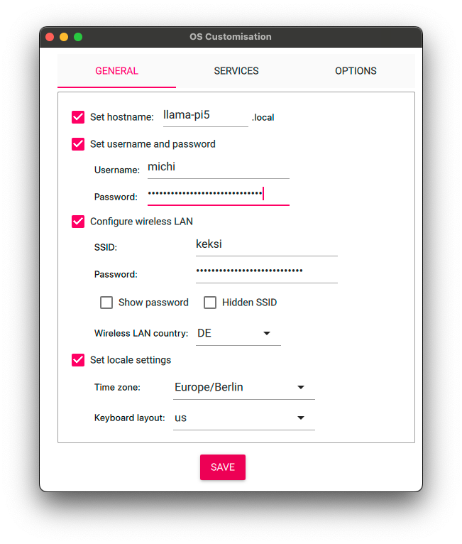 - General: Hostname (llama-pi5), Username/password (michi/generated and stored in 1Password), WLAN SSID/password (keksi), locale settings (Europe/Berlin, us keyboard layout)