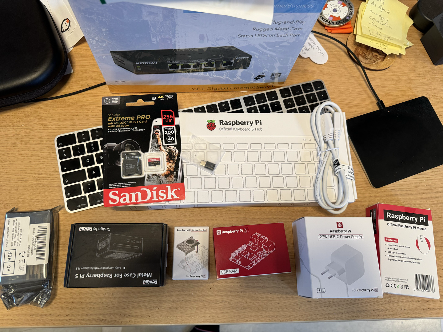 The Raspberry Pi 5 comes with Wifi support out-of-the-box. For local gigabit networks, I bought a new Netgear switch: NETGEAR GS305P PoE Switch 4 Port Gigabit Ethernet LAN Switch PoE+ 63W (5 Ports Plug and Play Network Switch PoE, Fanless, Robust Metal Case). Additionally, I got new CAT7 ethernet cables from Ugreen. Note: Consider getting an 8 port model or build a stack of multiple switches for many Pis.