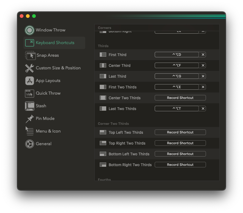 For window management, I bought the Rectangle Pro application on macOS. Rectangle Pro supports many keyboard shortcuts, I default to using ctrl option d or f or g to quickly position the selected window on the left/middle/right third of the screen.