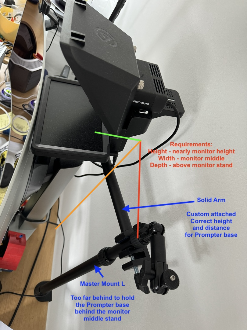 The Elgato Flex Arm Kit looked promising for extending the distance to the monitor. It needs to be attached directly to the top of Master Mount L, and was able to solve the distance problem - but brought a new problem with 10 cm too high, unable to match the speaker's viewing angle into the mirror (marked green in the picture). The Elgato Solid Arm finally allowed a side-way diagonal height adjusted position. It allows to attach to the Master Mount L with a custom lock, and mounts the Prompter/Facecam perfectly into the middle of the monitor, at the correct height for the speaker's view.