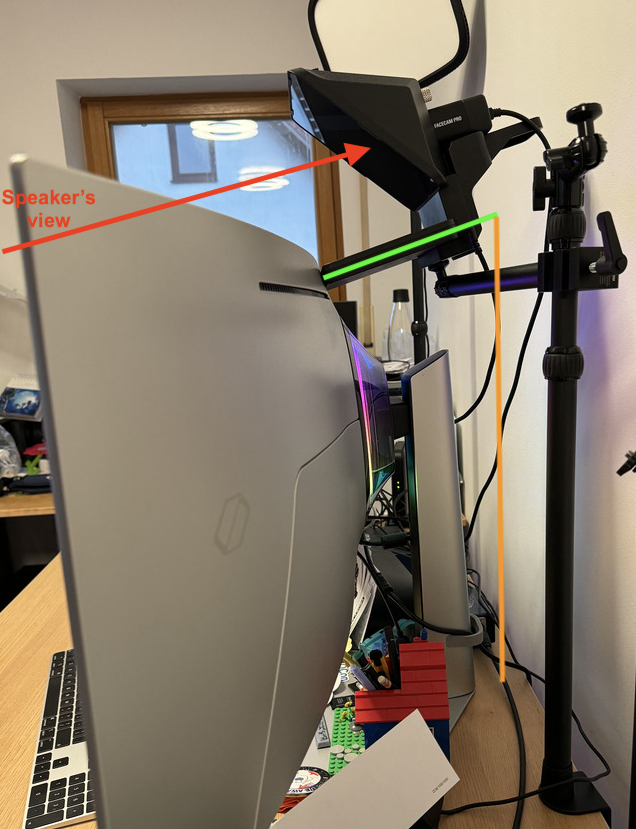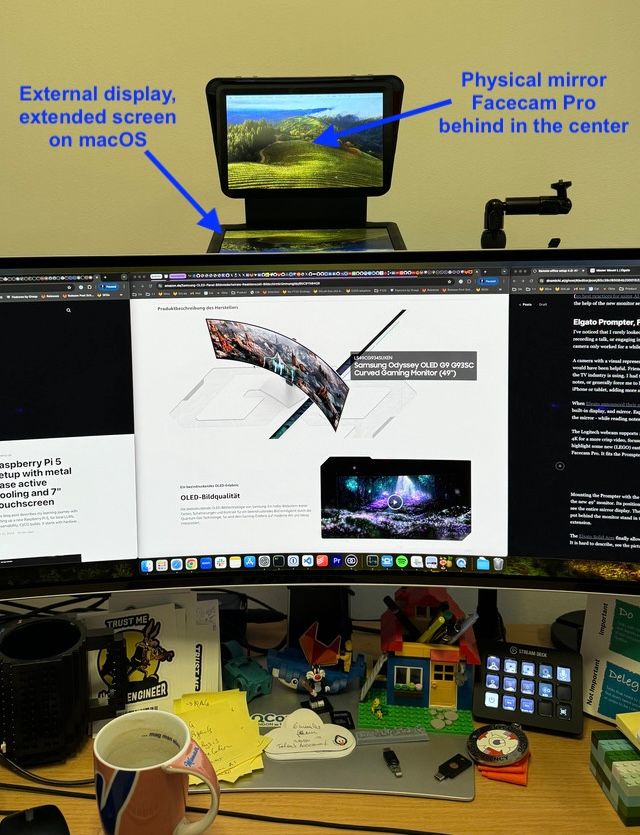 When Elgato announced their new Prompter product, I was fascinated by the built-in display, and mirror. Especially, because the camera can positioned behind the mirror - while reading notes, you always look into the camera. The Logitech webcam supports 1080p as resolution. After 4 years, I wanted to try 4K for a more crisp video, focussing on the speaker and background (and also to highlight some new (LEGO) eastereggs). This idea brought me to buying the Elgato Facecam Pro. It fits the Elgato Prompter setup perfectly, albeit it is quite expensive and only recommended when you plan with lots of streaming and talk recordings.