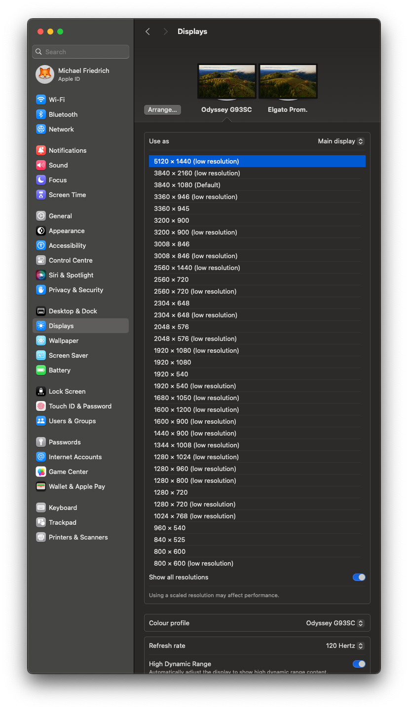The Samsung Odyssey monitor prefers DisplayPort 1.4 for full resolution and 120 Hz. HDMI only allowed for 60 Hz in my tests. Sacrificing a USB-C port on the Sonnet dock for the DisplayPort adapter cable could have worked, but I went with the CalDigit TS4 dock with more USB-C/A ports and native DisplayPort support.