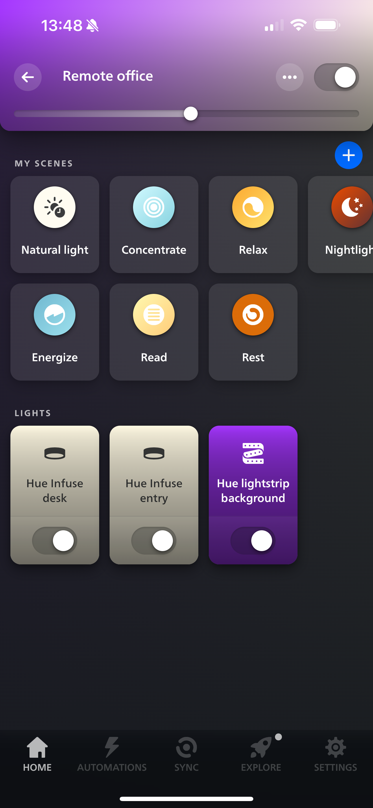 The Hue lights are connected to a central Philips Hue bridge, which itself is connected to Apple's Home app. "Hey Siri, remote office light on" has become my new routine during focus work.