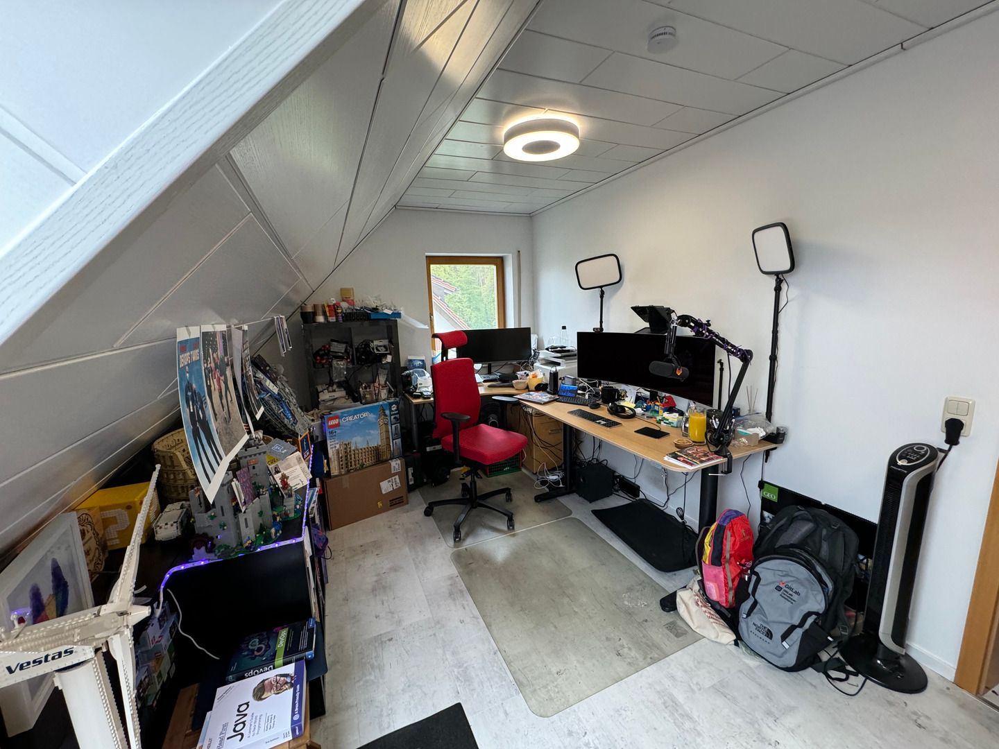 The 2023-new flat had different lighting, with rooms under the attic and windows left and back right, causing some glares on my face. I fixed lighting in two steps: