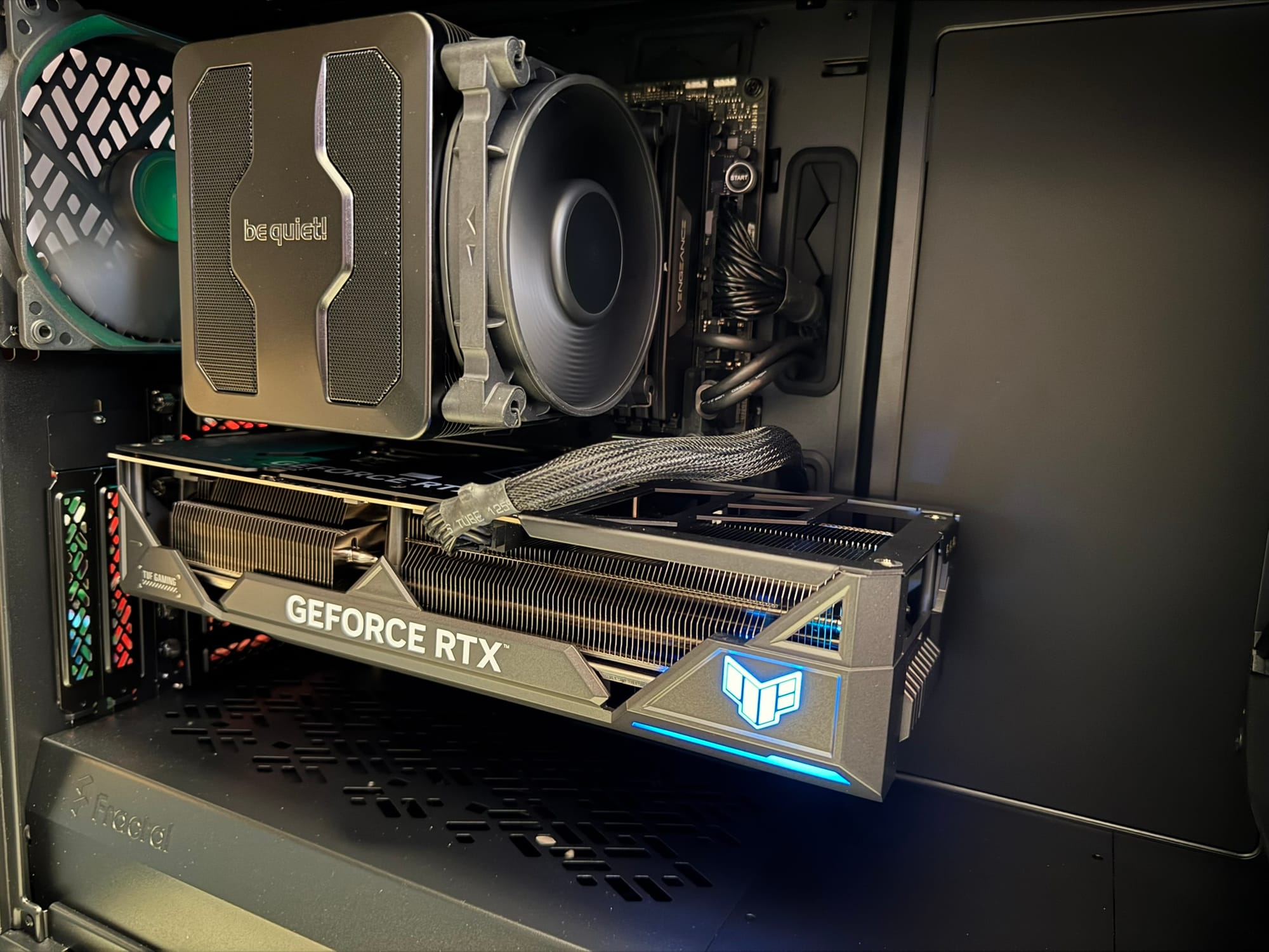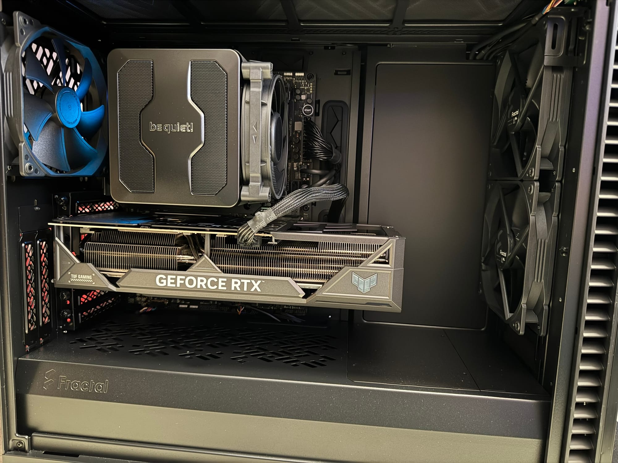 The PC is really silent. The be quiet! CPU cooler, the ASUS Geforce coolers, and overall case coolers do their magic, together with pre-defined mainboard PWM profiles. Left everything at default.