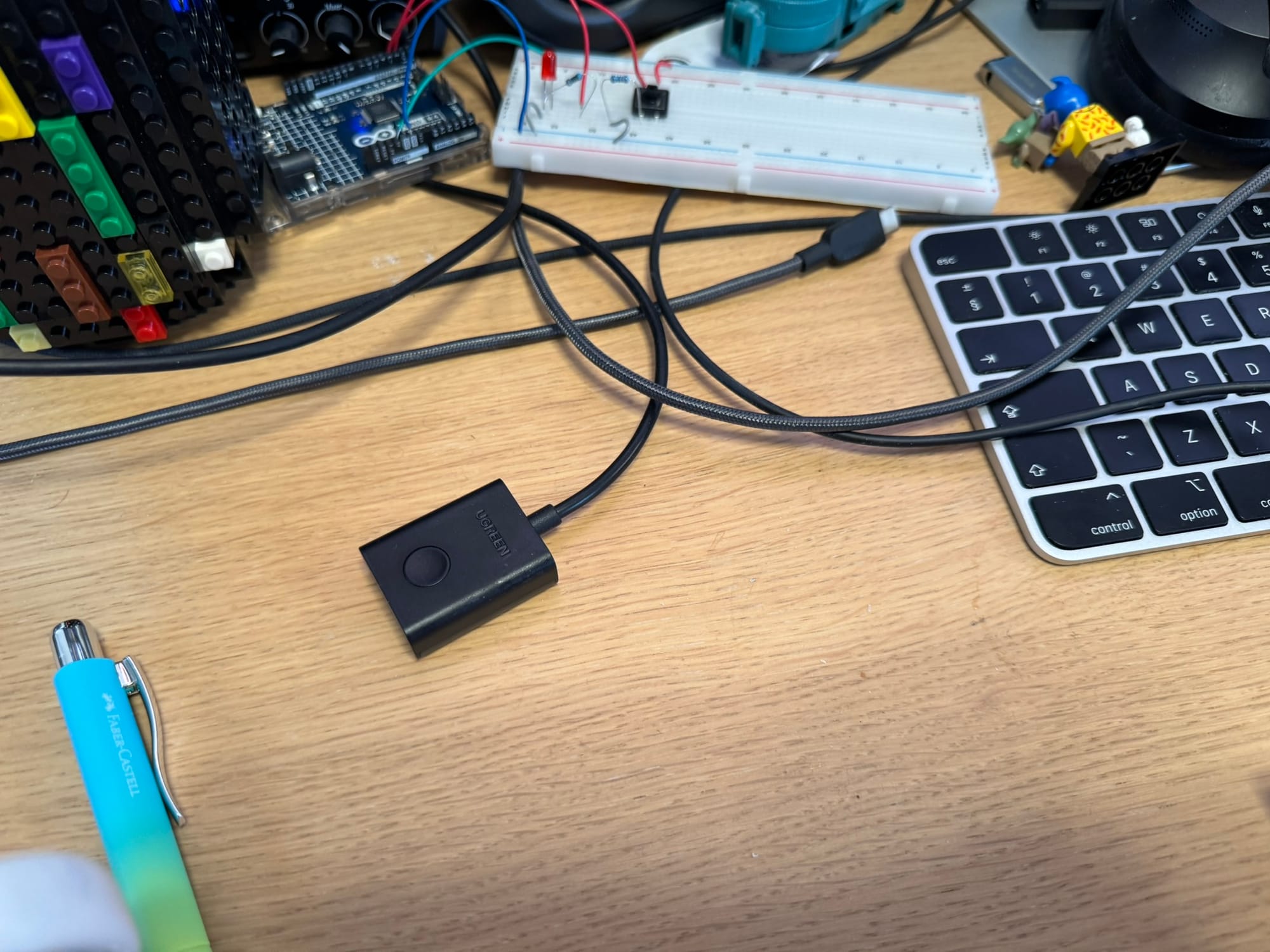 You don't see this in my Zoom calls - on the left of the standing desk, an old IKEA desk houses old PCs, monitors and also serves as embedded hardware connection spot. The printer on the table blocked that idea, and so I re-arranged the setup a bit.