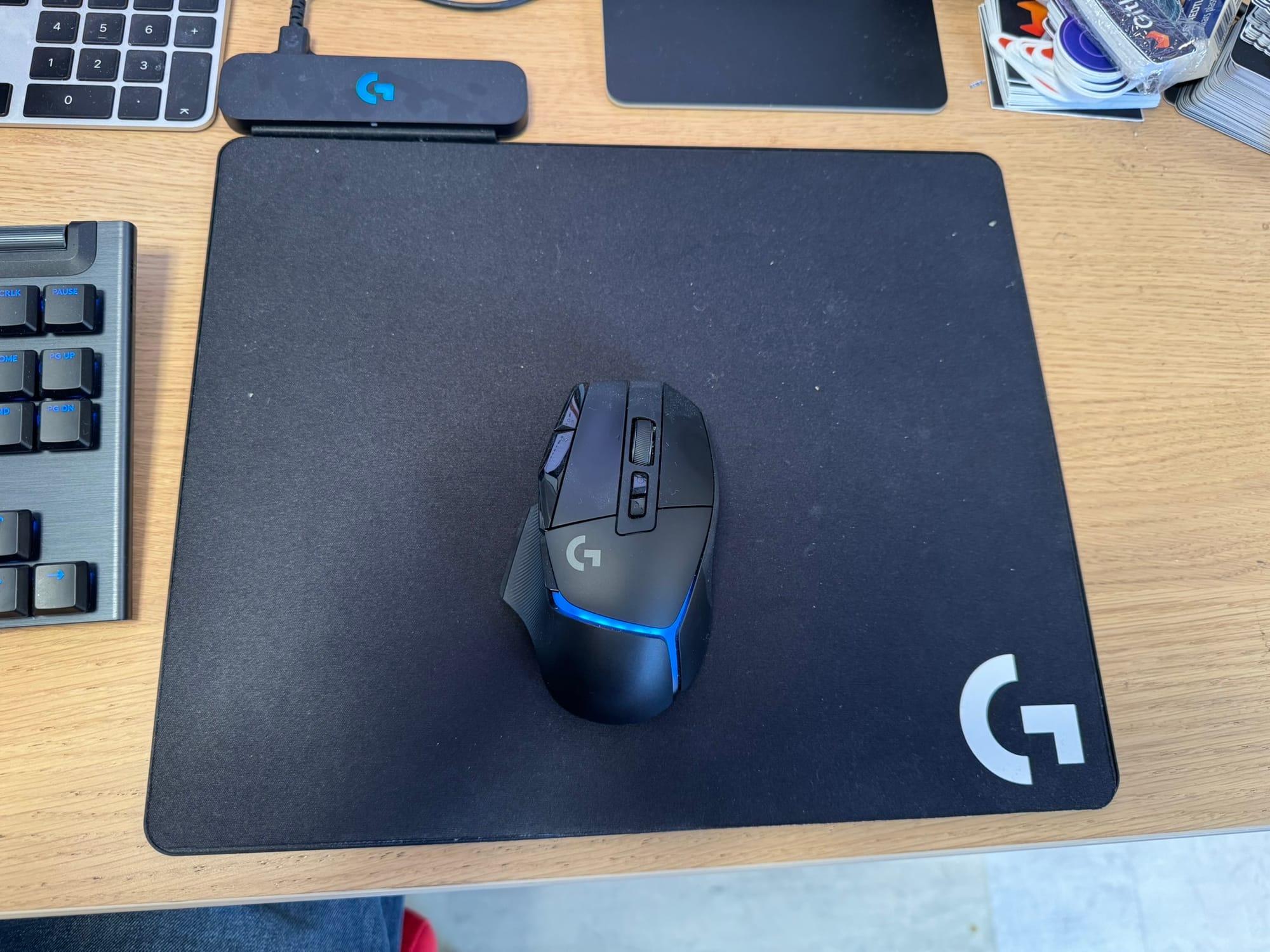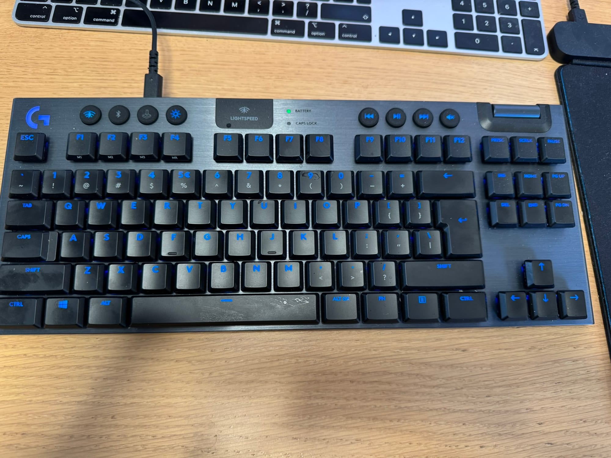 The Macbook works best with the Apple Magic Keyboard and Trackpad. This is my work environment, and must not be touched. Therefore, a new Windows Gaming keyboard and mouse were required. I always had good experiences with Logitech, except for the wireless mouse charging. Fortunately, the technology evolved and Logitech provides a wireless mouse on a gaming pad which automatically charges the mouse.