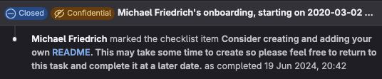 My onboarding issue from 2020-03-02 had 2 unticked boxes. One of them was to create a personal README to help everyone understand my work values, strengths and weaknesses, how to work with me, how to find me, experience and engagements. After multiple drafts, I went with bias for action to merge the MR.