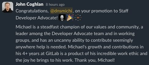 And last but not least, since it took me a while to realize, ... I GOT PROMOTED. Rebooting my career when joining GitLab in March 2020, the Staff level was my ambitious goal, and I am glad to have reached it super fast after 4.5 years.